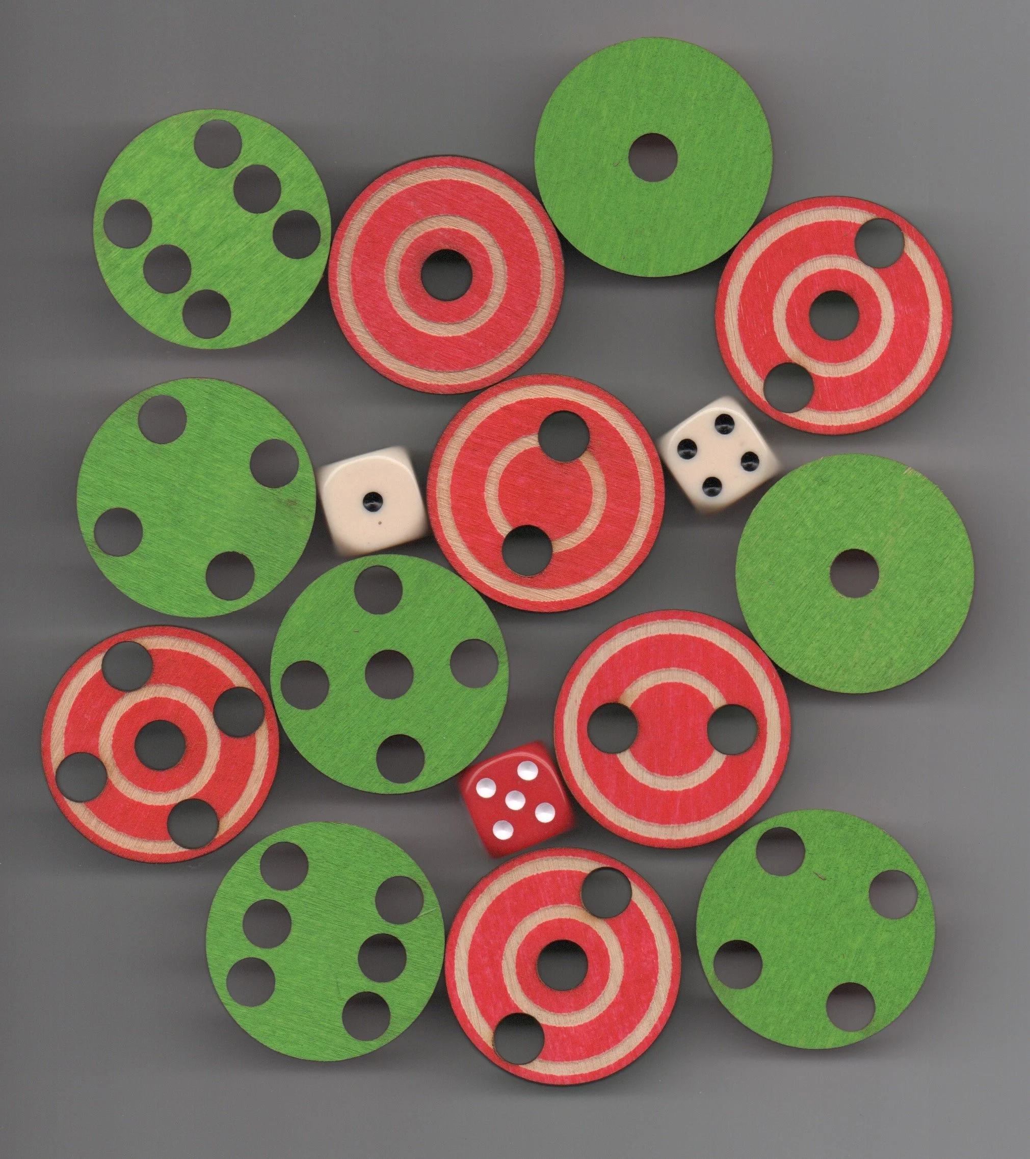 The game consists of 24 Birch ply wooden discs, 3 quality dice & a rules sheet, which all fit securely inside the Peruke tin.