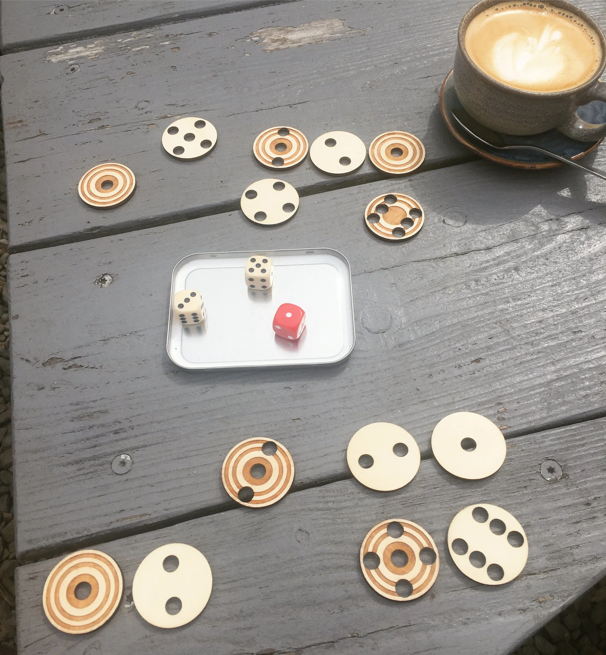 The game consists of 24 beech veneer wooden discs, 3 quality dice & a rules sheet, which all fit securely inside the Peruke tin.