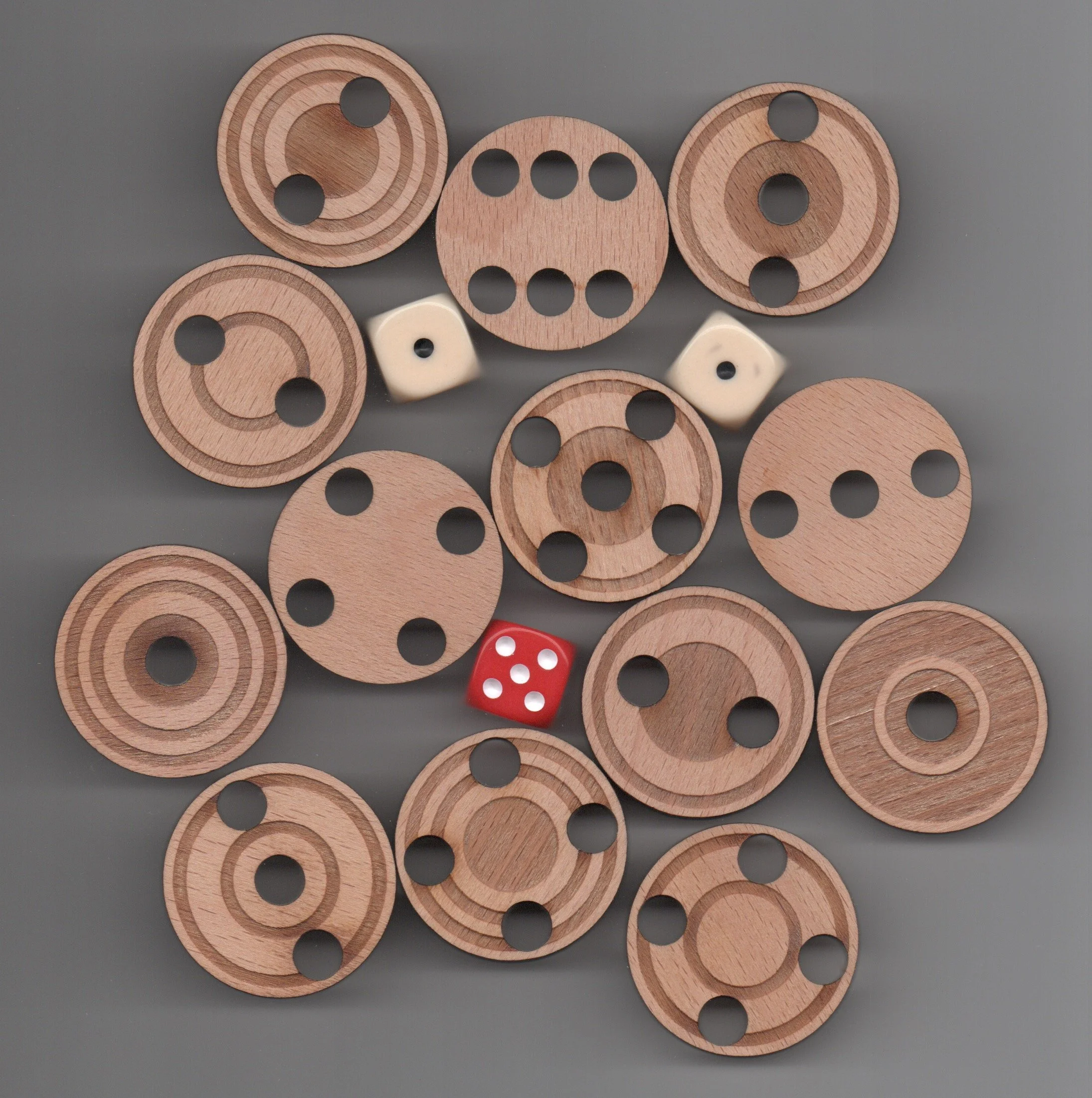 The game consists of 24 beech veneer wooden discs (with 4 different designs), 3 quality dice & a rules sheet, which all fit securely inside the Peruke tin.